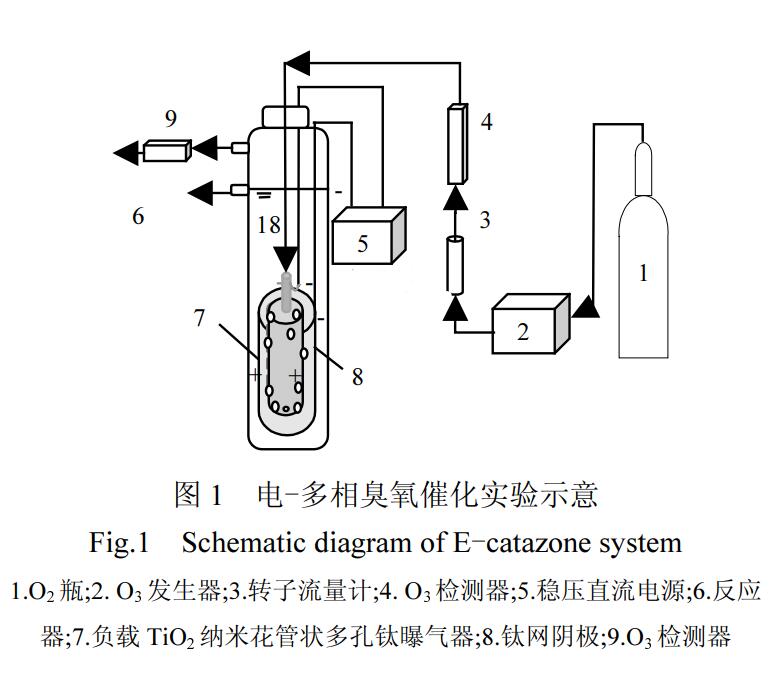 2.2 仪器 臭氧发生器(3S-T);稳压直流电源;管状多孔钛(长 20mm/Φ5mm,平均孔径 51μm);O3 浓度检测仪(3S-J5000);转子流量计(LZB-3WB);TOC 分析仪(vario TOC);COD快速测定仪(5B-1);DO 测定仪(Multi 3420);生化培养箱(LRH-250A);真空干燥箱(DZF6092);Milli-Q 纯水系统(A10);溶剂过滤器(T-50);隔膜真空泵(GM-0.33A)。