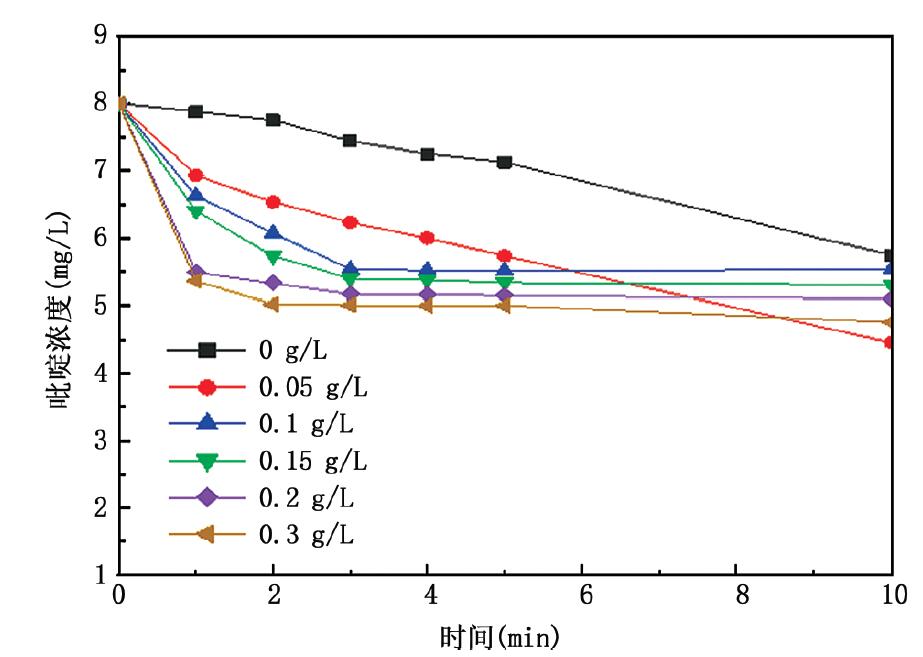 将制备的臭氧水取500 mL 置于烧杯中,加入所需质量的吡啶与磁性活性炭,通过搅拌桨不断搅拌。按照要求在0 min、1 min、2 min、3 min、4 min、5 min、10min 时取样,把取得的样品通过0. 45 微米的聚醚砜滤膜过滤去除催化剂,为了终止臭氧反应,再滴入一定量的亚硫酸钠溶液,得到的溶液作为待测样品保存。