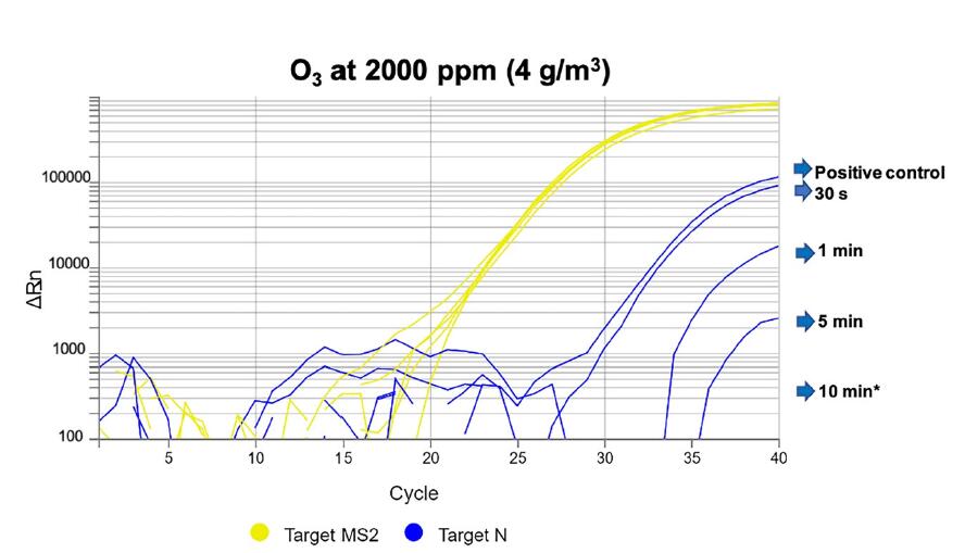 方法:用不同的臭氧浓度、暴露时间和相对湿度条件对热灭活SARS-CoV-2污染的PPE进行处理。实时聚合酶链反应检测SARS-CoV-2基因扩增。结果:1万ppm (20 g/m3)臭氧照射30 s、4000 ppm臭氧照射5 min、2000 ppm臭氧照射10 min后,个人防护装备中未见SARS-CoV-2扩增。在臭氧浓度较低时,4 - 12ppm (0.008-0.024 g/m3),影响高度依赖于相对湿度条件。