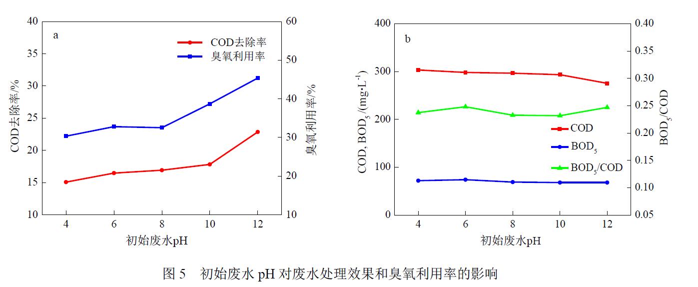 待处理废水COD 为357.0 mg/L,BOD5/COD 为0.12。在进气臭氧质量浓度为50 mg/L、RPB 转速为1500 r/min、气液比为5︰1、废水温度为20.0 ℃的条件下进行一级处理,考察初始废水pH 对废水处理效果和臭氧利用率的影响,结果如图5 所示。
