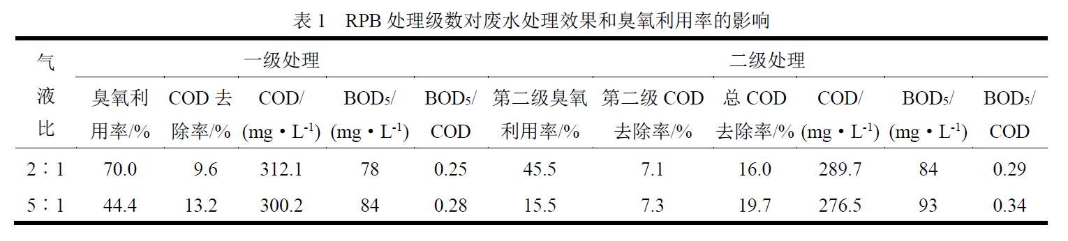 由表1 可见:RPB 两级处理效果明显优于一级处理;当气液比分别为2︰1 和5︰1 时,一级处理的COD 去除率分别为9.6%和13.2%,经过第二级进一步处理后,COD 的总去除率分别提高至16.0%和19.7%,表明增加处理级数可改善COD 的降解效果。由表1 还可见,当气液比分别为2︰1 和5︰1 时,一级处理后BOD5/COD 分别由原水的0.18 提升至0.25 和0.28,经第二级进一步处理后,BOD5/COD 进一步升至0.29和0.34,分别为原水的1.61 和1.89 倍,表明增加处理级数可进一步提高废水的可生化性。经过RPB 两级处理后,出水基本满足后续生化处理要求。