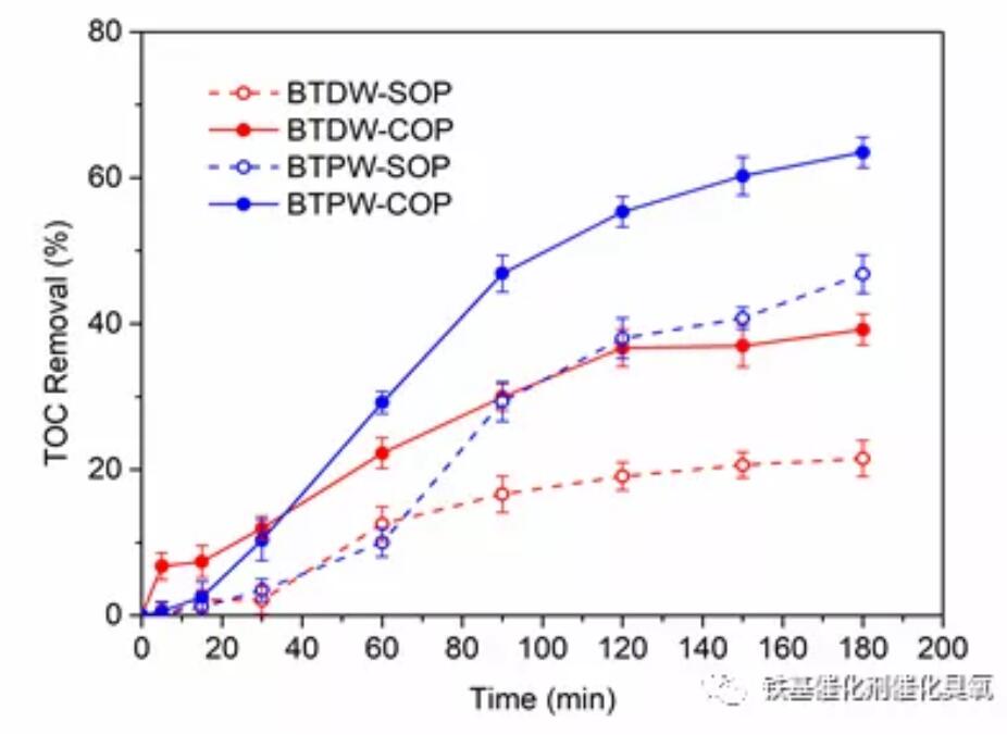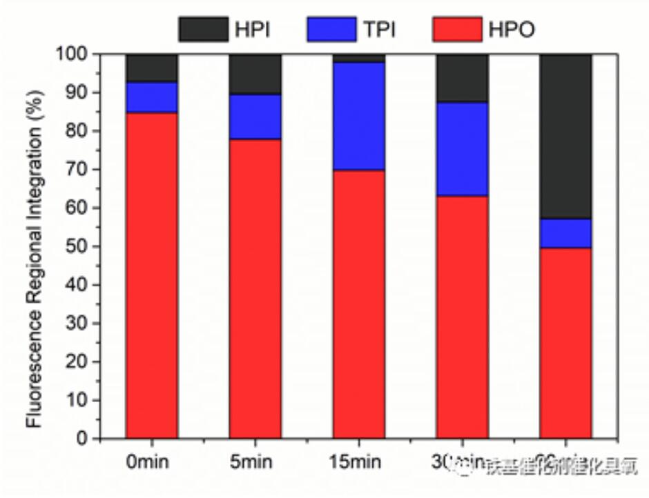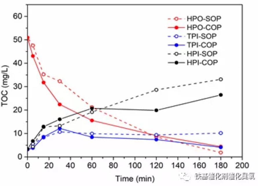 根据目前的分析手段,把印染废水中的有机物分为三类:疏水性物质(HPO)——红色、过渡亲水性物质(TPI)——蓝色、亲水性物质(HPI)——黑色,三种物质(浓度以TOC表示)氧化过程中变化见下图。