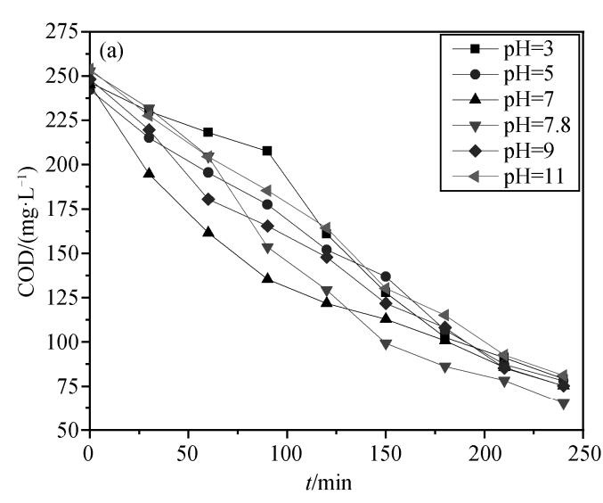 在催化剂投加量为 30%, 臭氧流量为 3 L/min的条件下, 设置废水初始 pH 分别为 3, 5, 7, 7.8 (不调 pH), 9 和 11, 探讨废水初始 pH 对催化臭氧化降解效果的影响, 结果如图所示。