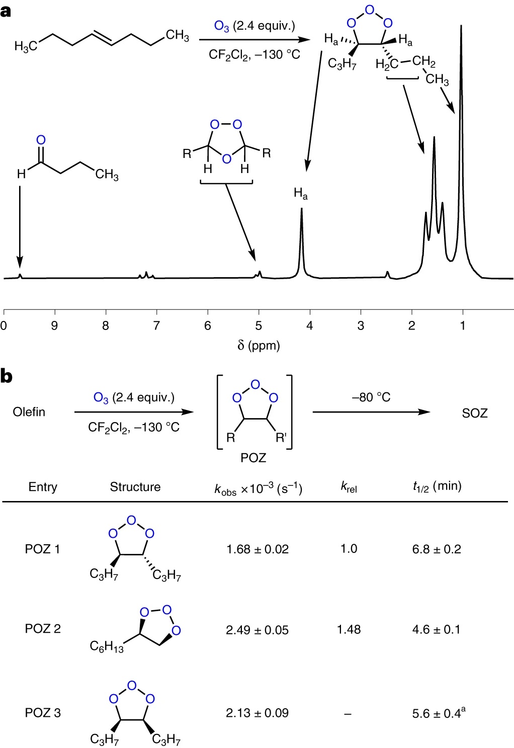 尽管臭氧分解反应已被科学家研究了150多年,但其反应机理在某些方面仍尚不清楚。目前,普遍接受的Criegee机制涉及三种中间体(图1a):POZ、Criegee中间体(CIN)和二级臭氧化物(secondary ozonide,SOZ)。为了理解化学结构和反应性之间的关系,化学家对三类中间体进行了许多机理研究,特别是关于Criegee中间体和SOZs形成的见解导致其在主流合成中的应用,而POZ因其寿命和反应性导致其不能作为合成中间体。为了更好地解析烯烃臭氧分解机理,化学家对POZ进行研究,结果表明POZ是通过syn-[3+2]环加成形成,同时动力学实验表明其在低温(小于或等于-100 ℃)下具有有限的寿命,但对这些中间体的基本反应模式却研究很少。为此,作者使用低温1H NMR光谱评估了烯烃几何结构(如:trans-、末端和cis-烯烃衍生的POZ(1-3)中间体)对C-C键裂解速率的影响(图2a),结果表明POZ在合成有用的温度下具有有限的寿命(图2b)。其次,作者对POZ的化学反应性进行了考察,即POZ是否会在C-C键裂解前被亲核试剂在O-O键处捕获。当使用乙醚为溶剂于-116℃(POZ不易裂解)下进行反应以实现烯烃的syn-二羟基化时,作者发现典型的过氧化物淬灭剂(如:二甲基硫醚、三苯基膦(Ph3P)、亚磷酸三乙酯((EtO)3P)和四甲基乙二胺)产生了典型的臭氧分解产物,而异丙基溴化镁(i-PrMgBr)则能以中等至较好的产率获得双羟基化产物。