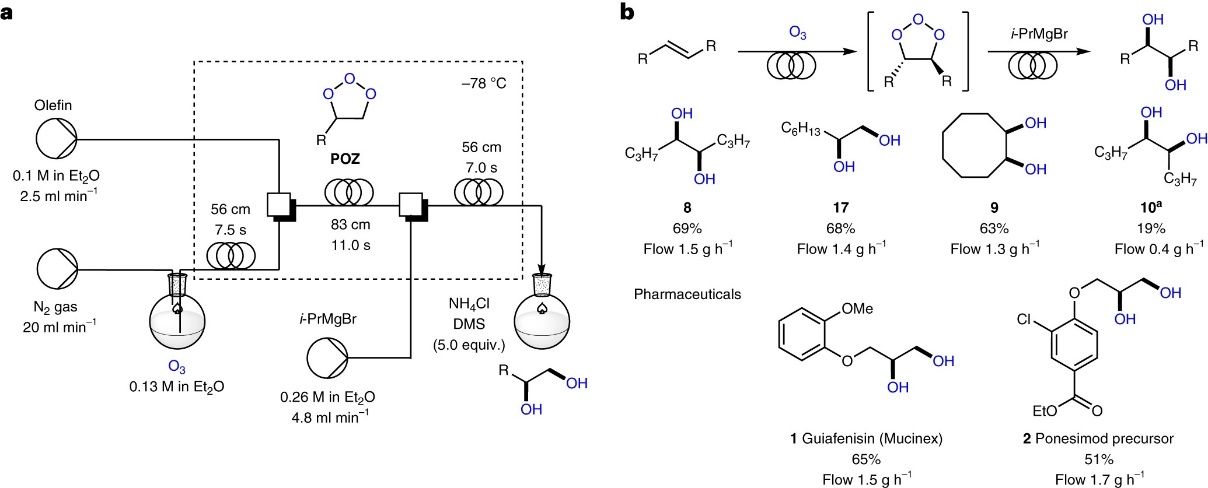 Andy A. Thomas教授团队发展了一例安全、绿色的烯烃syn-双羟基化反应,即利用亲核试剂捕获O3与烯烃形成的POZ中间体进而生成双羟基化产物。此外,将该方法与连续流反应器结合后,不仅可以消除过氧化物的积累,而且可以制备药物相关小分子化合物。