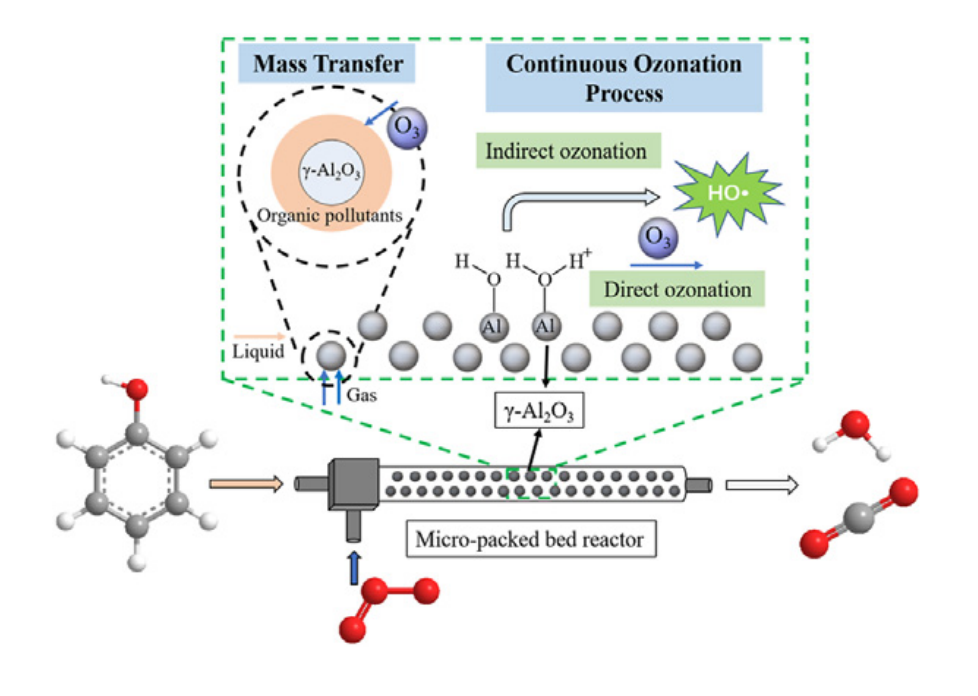 结果表明,臭氧氧化在25 s内对亚甲基蓝的降解效率为74.6%,反应速率常数约为0.05 s-1 (He et al., 2016)。Nieves等人报道,在康宁先进流动反应器(AFR)中,当液体流速为5 mL/min,气体流速为100 mL/min,传质系数为0.80 s-1时,苏丹红7B染料的转化率为66.5% (Nieves- remacha and Jensen, 2015)。微填充床反应器是在滴流床反应器小型化的基础上提出的。由于小填充颗粒(颗粒直径<500 mm)的传输尺寸小,因此它具有增强传热传质和加快多相混合的优点(Zhang et al., 2018a)。mpbr由于其在气-液-固反应(如加氢)中的优势而受到关注(Losey et al., 2000;Yang et al., 2018;Tu等人,2020)和氧化(Yoswathananont等人,2008;al - rifai et al., 2014,2016)。al - rifai et al.(2016)报道mPBR气液比的增加提高了苯甲醇的转化率和苯甲醛的选择性。Tu等(2020)报道mPBR中连续加氢反应速率提高了100倍。我们之前的研究表明,mpbr中的气液传质系数可高达0.12e0.39 s-1,比大型反应器的传质系数大1-2个数量级(注:反应器参数与本工作一致)(Zhang et al., 2018a;Sang等人,2020)。迄今为止,mpbr与臭氧氧化相结合处理有机污染物的研究尚未见报道。因此,优异的气液传质速率表明mPBR具有实现臭氧化高效降解难降解有机污染物的潜力。本文研究了一种基于mpbr的连续臭氧化系统,用于降解难降解有机污染物。考察了液流量、气流量、初始pH、初始O3浓度和初始苯酚浓度对苯酚和COD去除率的影响。比较了氧化锆陶瓷球团和g Al2O3球团填料在mPBR中的去除率。此外,在很佳操作条件下对几种典型的有机污染物(包括酚类、抗生素和染料)进行了处理。