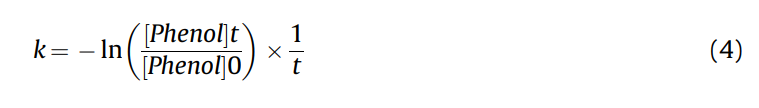 采用高效液相色谱法(HPLC 1260 Infinity II, Agilent)测定有机污染物(包括苯酚、NB、AN和BPA)的浓度。HPLC与UV检测器联用,柱温30℃;注射量,5 mL;紫外波长,270 nm;流动相组成:乙腈:水(70:30,v/v), 1.0 mL/min;色谱柱,Agilent Eclipse加C18 (4.6 * 250 mm, 5mm)。采用高效液相色谱(Agilent 1260 Infinity II)和紫外检测器,在柱温为30℃的条件下测定抗生素(包括NOR和ENR)的浓度;注射量,5 mL;紫外波长278 nm;流动相组成:乙腈:磷酸盐缓冲液(35:65,v/v), 1.0 mL/min;色谱柱,Agilent Eclipse加C18 (4.6* 250 mm, 5mm)。臭氧化后酚类和抗生素的去除率(d)由下式计算: